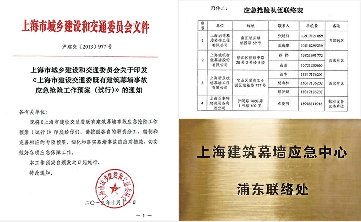 2013年,上海市成立既有幕墙事故应急抢险中心,太阳集团被市建交委指定成为中心四个救援单位之一。为此,太阳集团专门组建了一支由幕墙技术专家、安全巡视联络员、维修技术人员组成的专业团队,负责对上海市既有幕墙的检查、检测和维护保养工作。